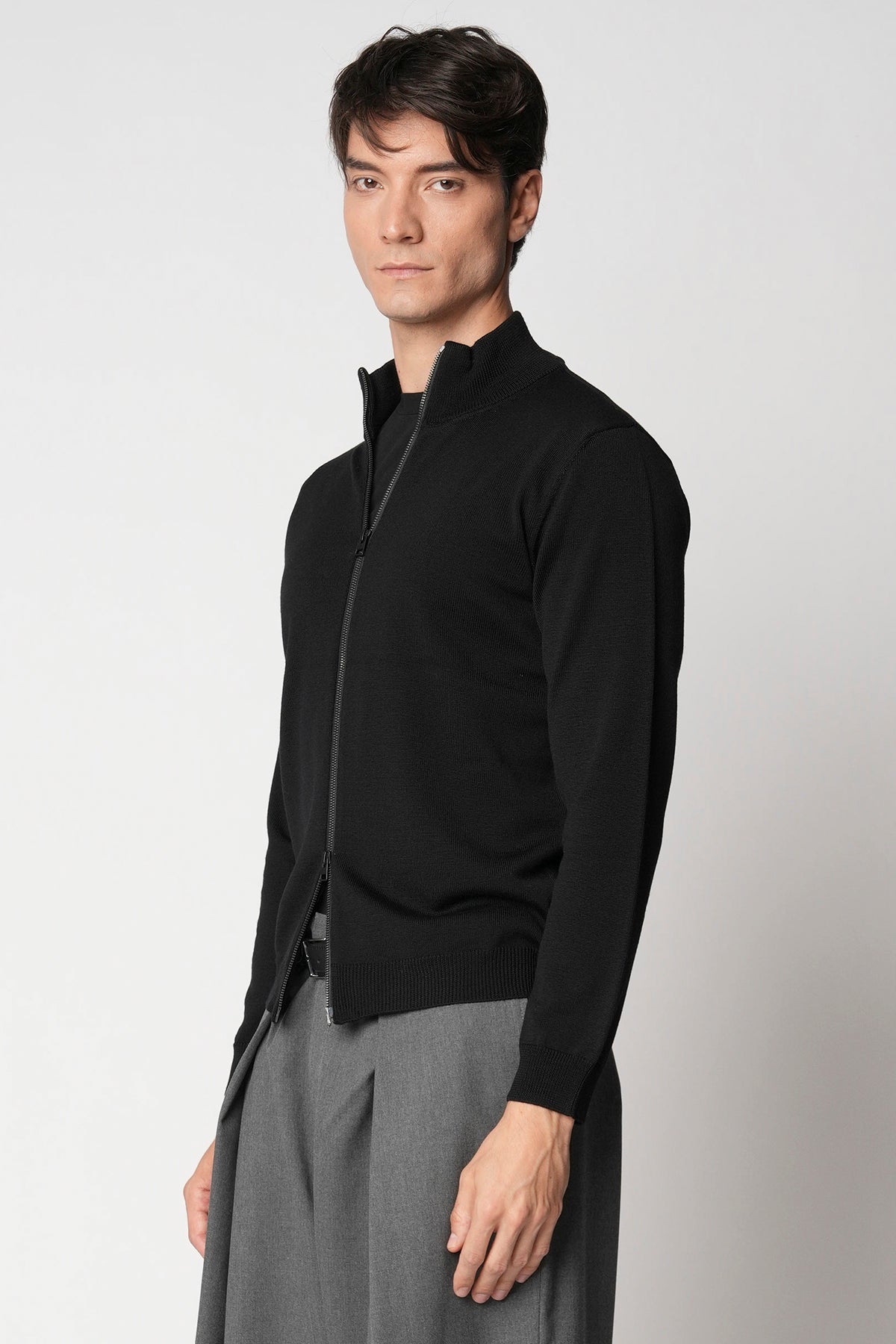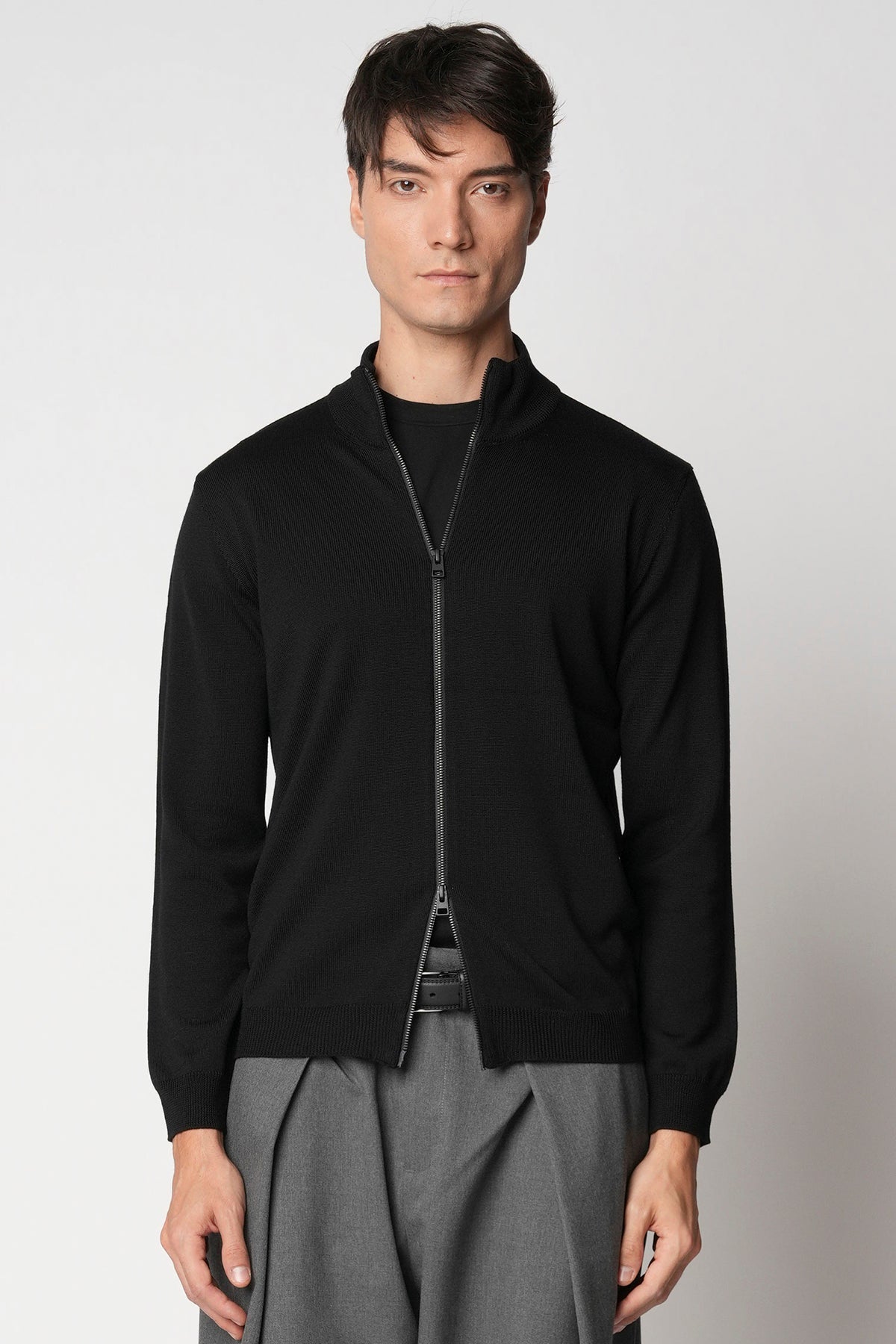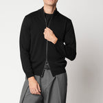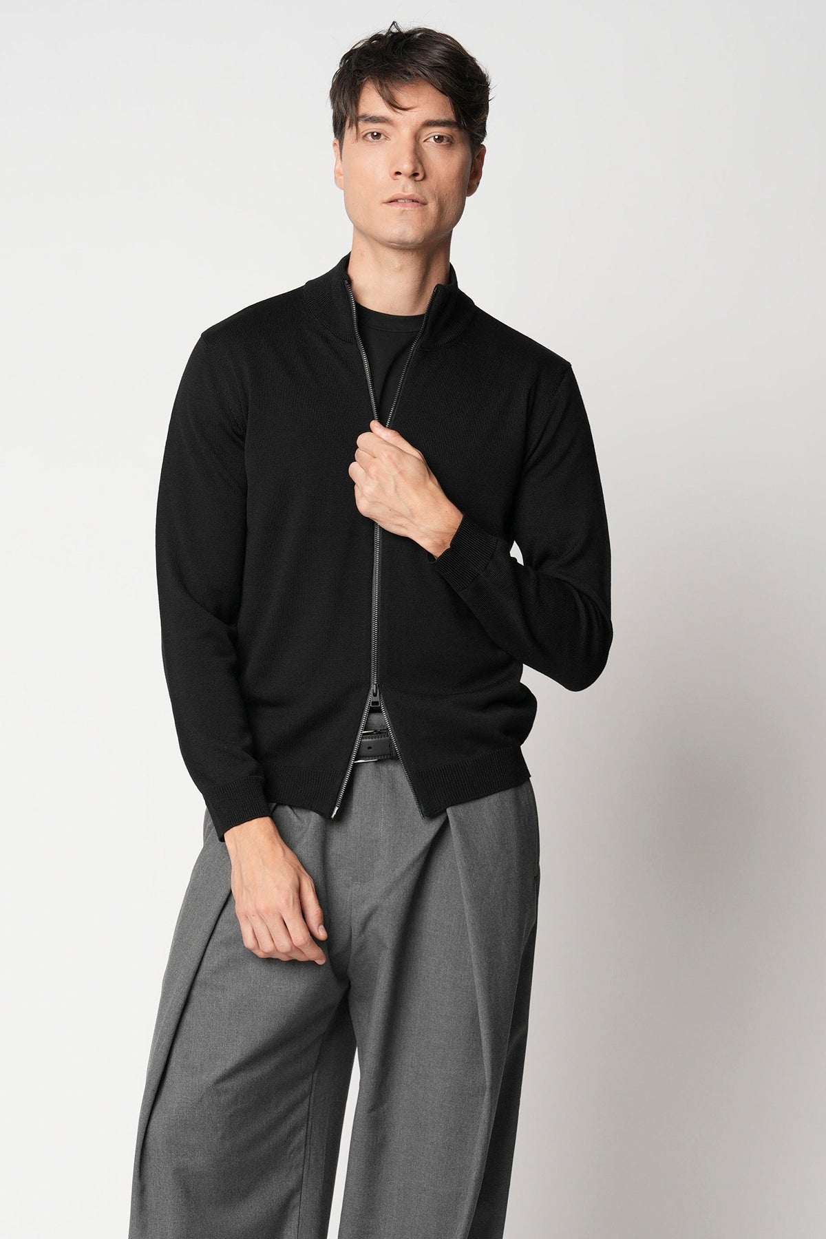Born from the meeting of two strands of extrafine merino wool, expertly woven to create a knit jacket that combines strength and softness, comfort and character. The double zipper glides smoothly, revealing a sporty yet deeply refined soul. With its regular fit and the warm, enveloping feel of wool, it naturally accompanies your daily movements: lightweight and versatile in transitional seasons, precious and protective on colder days. A garment that reflects attention to detail and the pursuit of the perfect balance between style and functionality.