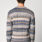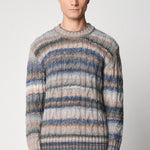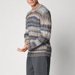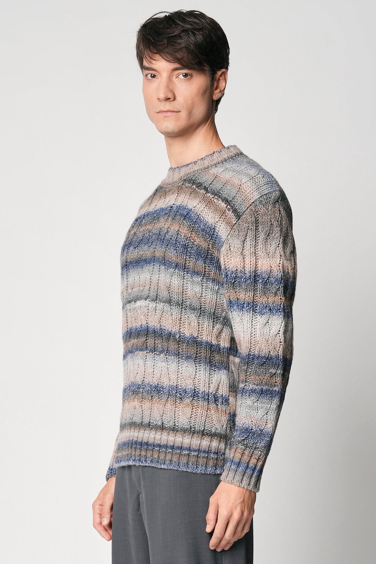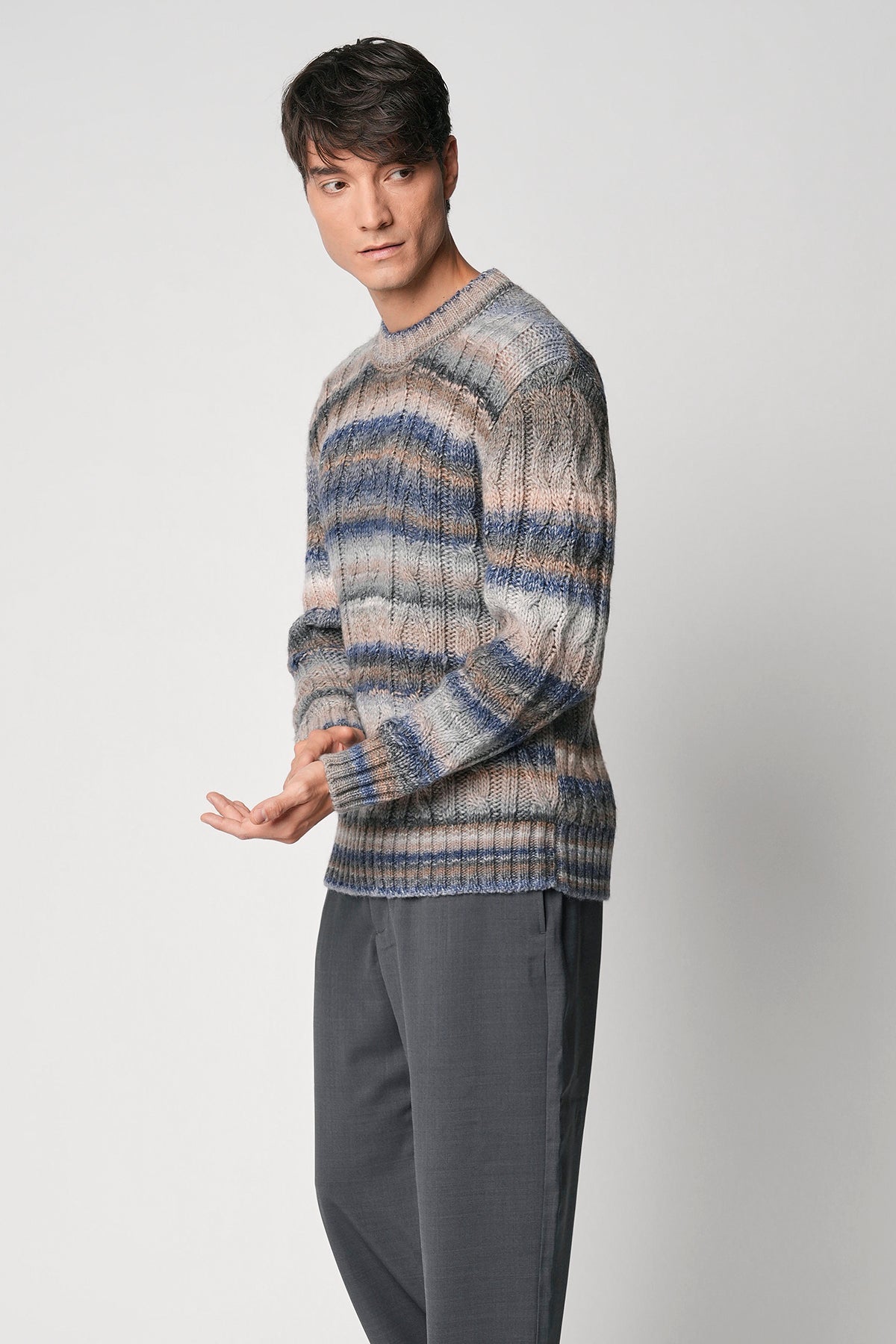 Girocollo relaxed fit in filato misto lana dalla vestibilità comoda, caratterizzato da una texture di trecce e coste a righe multicolore. Il design con spalle scese e i bordi a coste aggiungono un tocco casual e raffinato, mentre il particolare filato stampato esalta l’effetto cromatico unico del capo.