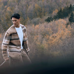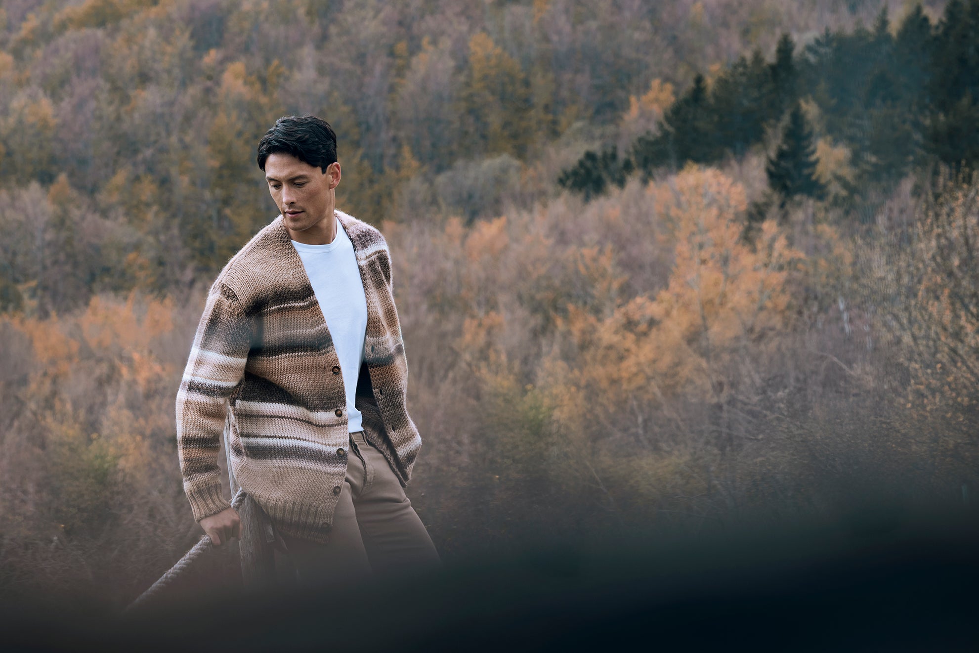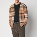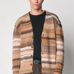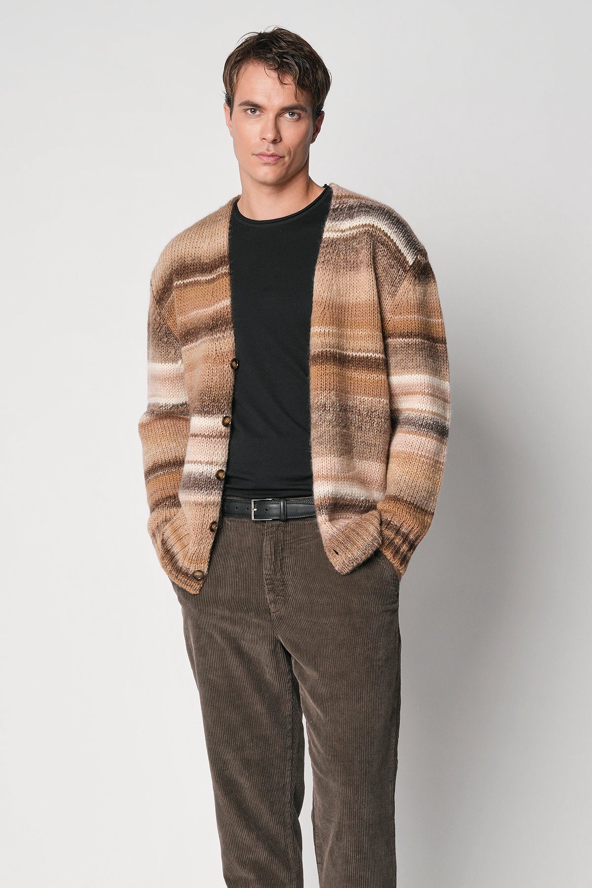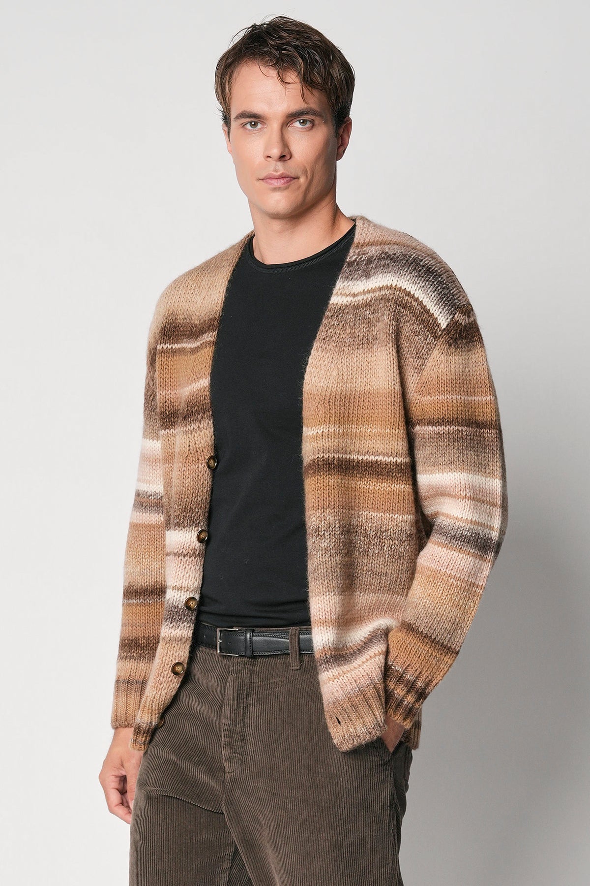 Cardigan relaxed fit in filato misto lana dalla vestibilità comoda, caratterizzato da una texture a righe multicolore. Il design con spalle scese e i bordi a coste aggiungono un tocco casual e raffinato, mentre il particolare filato stampato esalta l’effetto cromatico unico del capo.