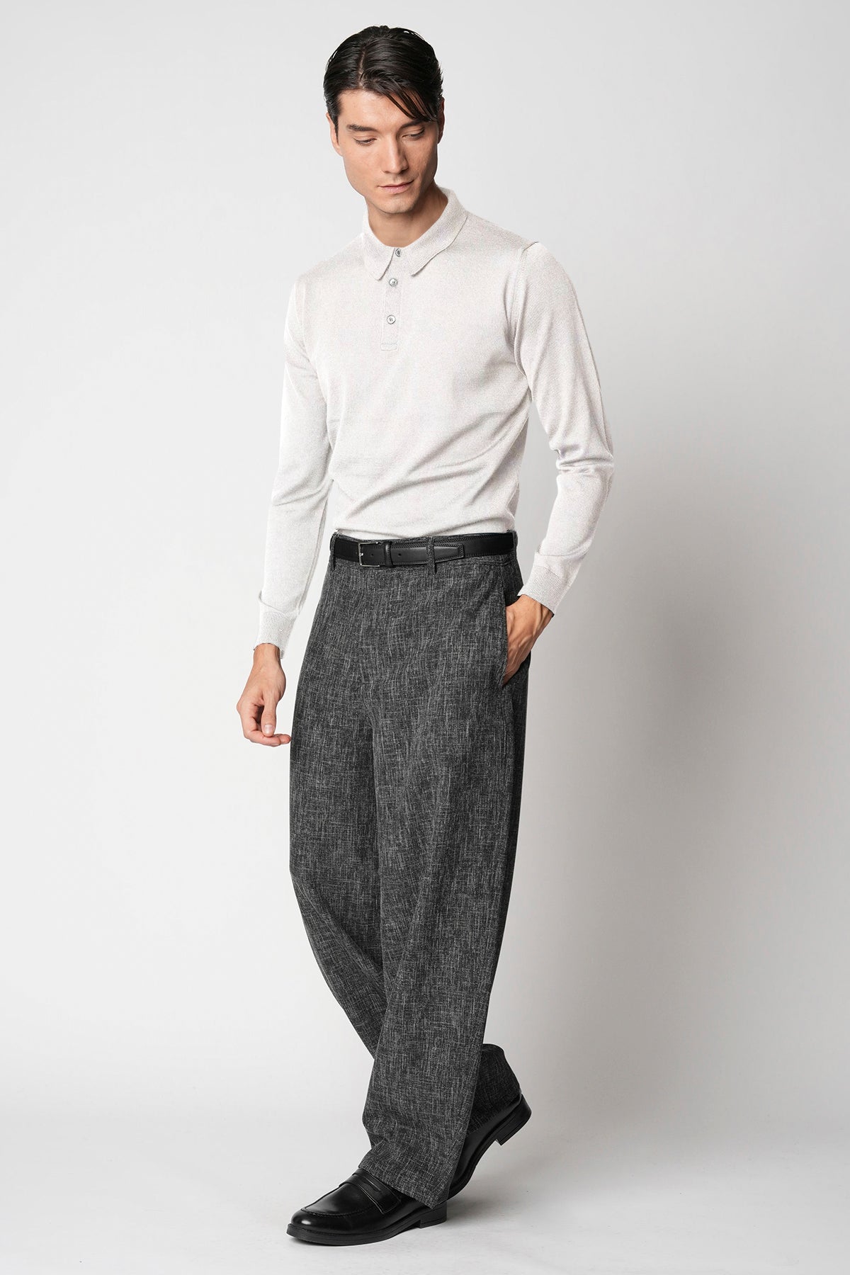 Il modello è alto 187 cm, petto 96 cm, vita 80 cm e veste una taglia 50.
